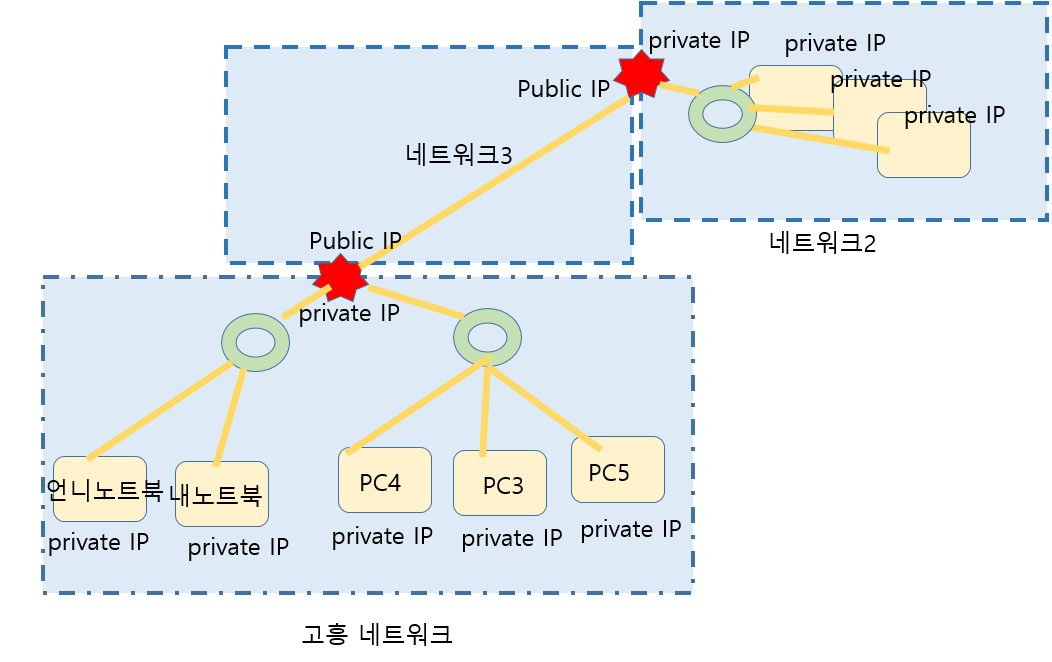 이렇게 각 PC에 private IP를 라우터가 줬을거에요.