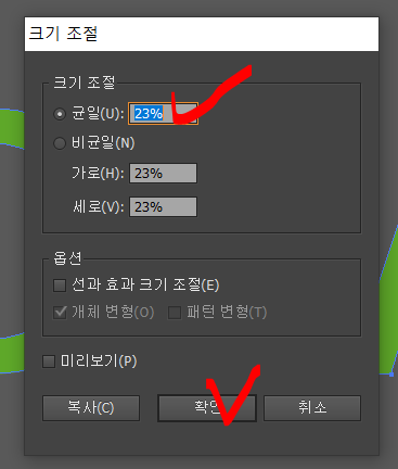 크기조절도구를 더블클릭하여 원하는 만큼 줄여줍니다. 원래 100%였는데 저는 23%로 줄여주도록 했어요. 만약 더 크게 하고 싶다면 110% 이런식으로 입력하시면 되겠죠?