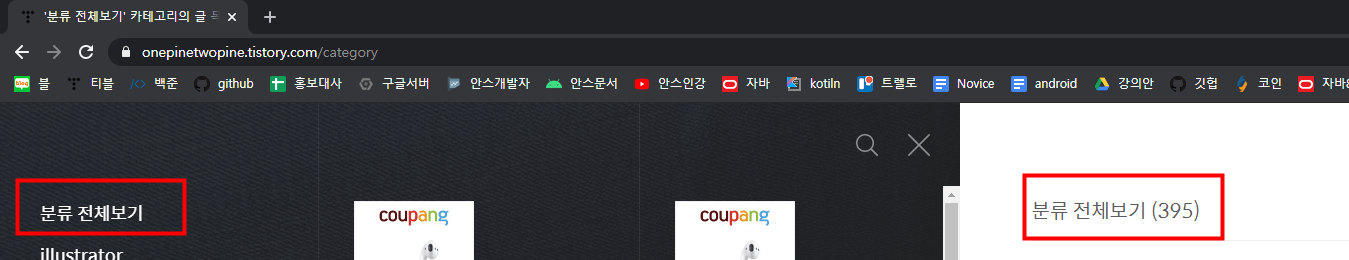 크롬 시크릿모드(control shift n)로 들어가서 티스토리 페이지로 이동 후, 분류전체보기를 누르면 확인가능합니다.